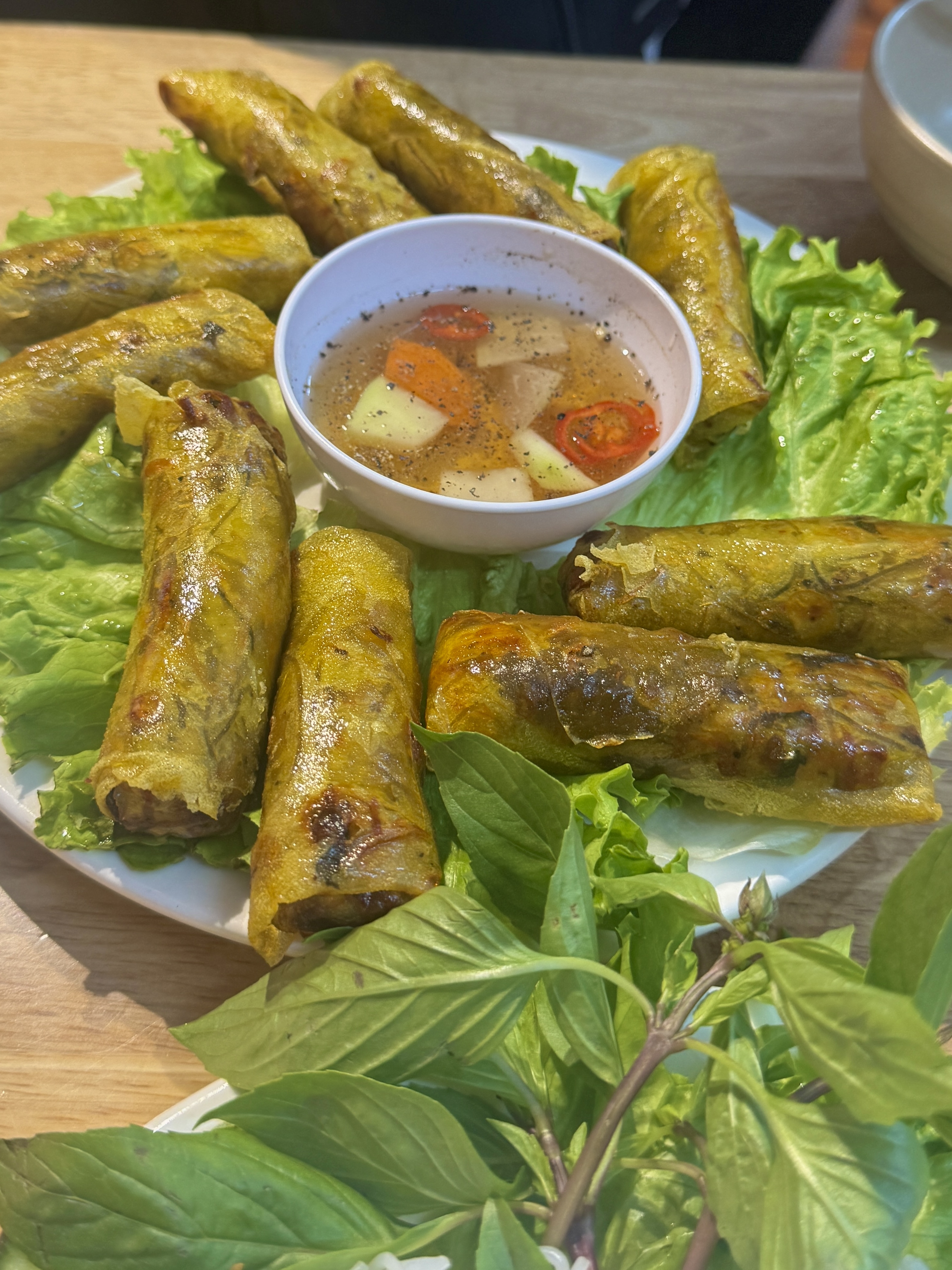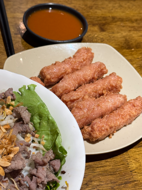 돼지고기를 돌돌 말아 튀긴 형태의 넴은 부드럽고 쫄깃해 특이한 식감을 자랑한다. 국수랑 궁합이 매우X3 좋음.